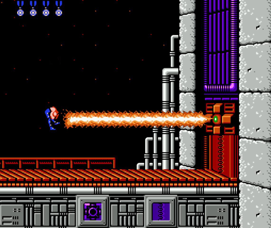 《魂斗罗》2关和4关是进入红隼的防御基地,这两关的玩法发生了很大的变化。面对的则是炮塔和电源,炮塔打不打都无所谓,只要打烂电源就可以通往下一个场景。